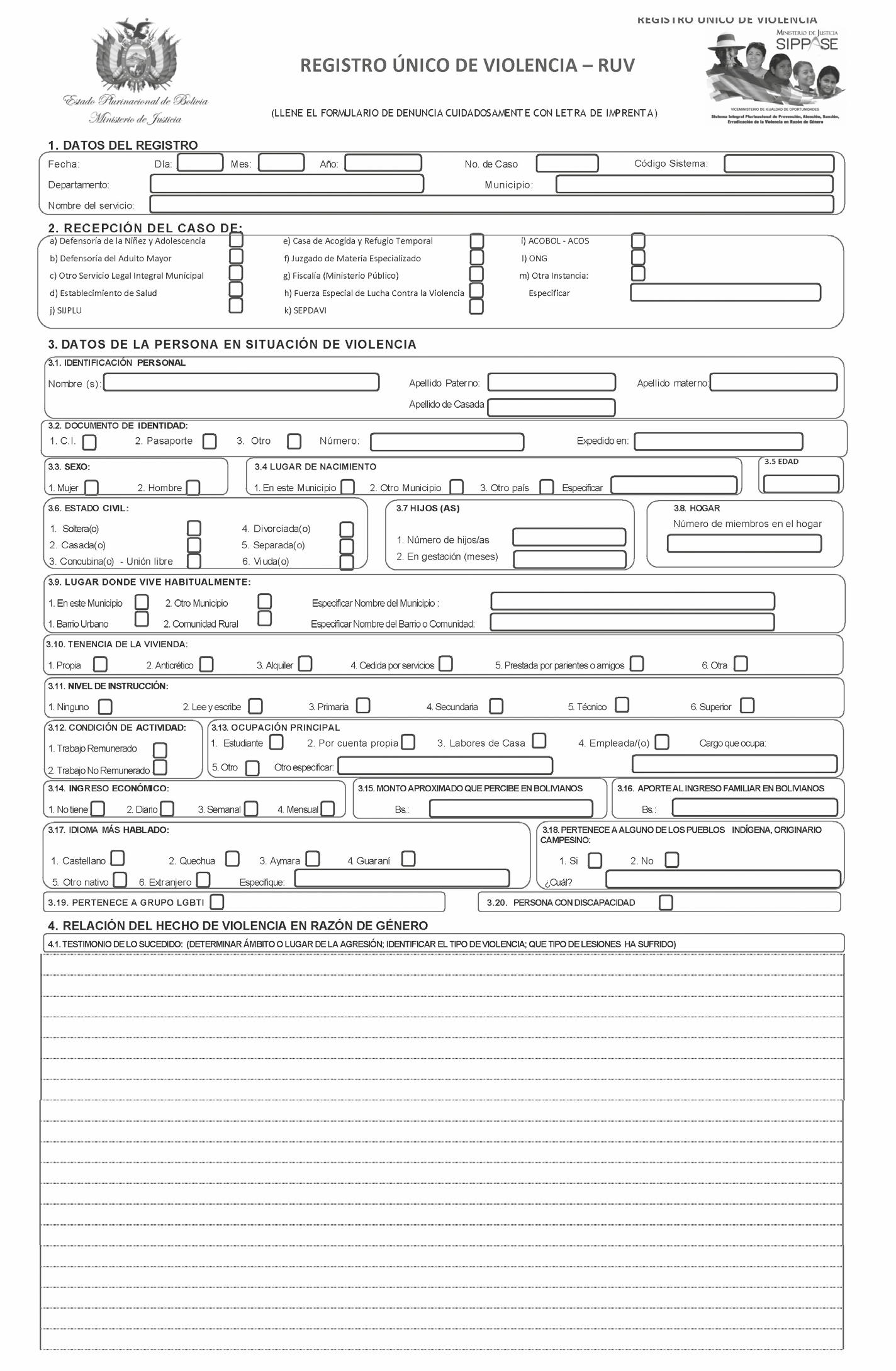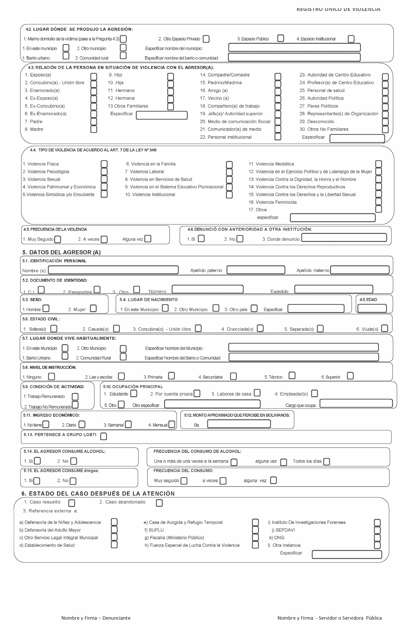 En Bolivia datos oficiales señalan que 7 de cada 10 mujeres sufren algún tipo de violencia en sus hogares. Un 75% de mujeres en situación de violencia reincidente no presenta ninguna denuncia. Del total de mujeres que declaran haber sufrido violencia en sus hogares, el 53% no toma ninguna acción y sólo poco más de un 17% realiza la denuncia6.